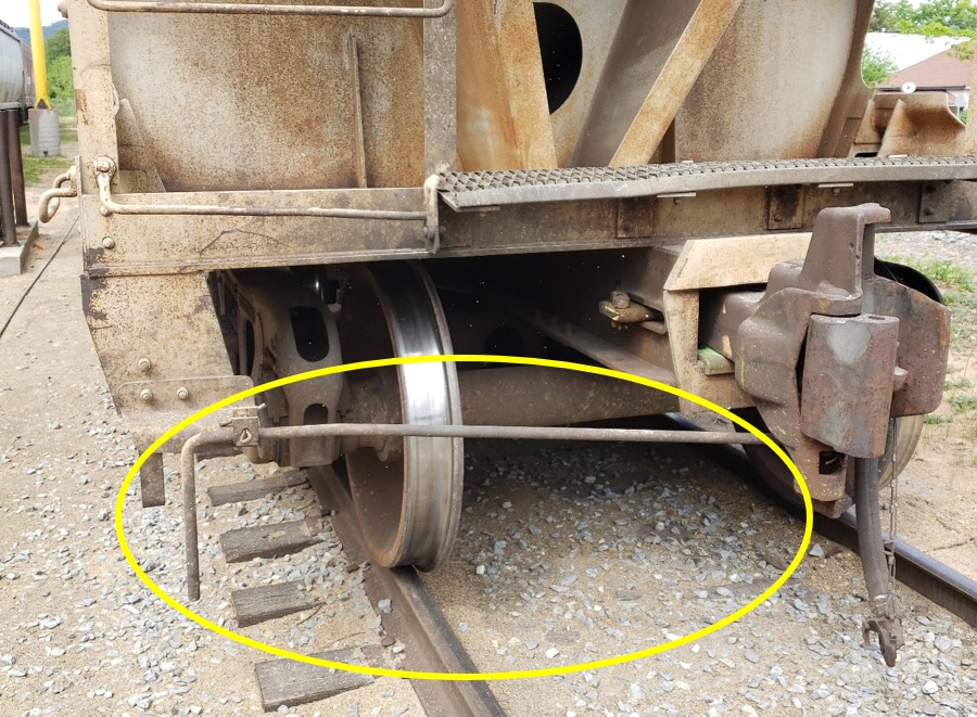 Pendant les manœuvres d’aiguillage au triage Alyth C, on effectue des manœuvres de poussage libre de wagons sur la voie désirée au moyen de locomotives télécommandées par le contremaître à l’aide du STL. Pour effectuer des manœuvres de poussage libre, les locomotives poussent le mouvement jusqu’à ce qu’il atteigne la vitesse désiréeNote de bas de page 11. Pendant que les wagons passent à l’emplacement de la zone de dételage, le contremaître actionne manuellement le levier de dételage pour déverrouiller la mâchoire à l’endroit de dételage souhaité (figure 4). Pour terminer le processus de dételage et mettre le wagon en mouvement, le contremaître serre les freins sur les locomotives. La décélération commence aux locomotives, puis elle est transférée en séquence vers le wagon de tête, ce qui porte le jeu entre les wagons à un état de « traction ». Lorsque l’augmentation du jeu des attelages atteint l’attelage déverrouillé, le wagon prévu se sépare et continue de rouler sur la pente légère vers la gare de triage. Plusieurs wagons attelés entre eux peuvent être poussés en utilisant le même processus.
