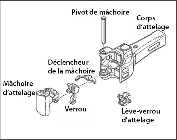 Au moment de l’attelage à un autre wagon, la mâchoire est conçue pour passer automatiquement de la position ouverte à la position fermée et verrouillée. Lorsque l’attelage se referme, la mâchoire pivote autour du pivot de mâchoire de manière à ce que sa face s’engage dans la face de la mâchoire de l’autre wagon. Lorsque les extrémités des mâchoires rentrent dans le corps d’attelage de chaque wagon, les verrous des attelages se mettent en place sur chaque attelage, verrouillant ainsi les mâchoires (figure 7). Dans l’exploitation normale du train, la direction et l’amplitude des forces dans les attelages varient toutes deux considérablement. Par exemple, lorsque des wagons sont poussés, la contrainte dans la mâchoire alterne entre tension et compression; les forces en-train alternent entre contrainte de traction (train étiré) et contrainte de compression (train comprimé).