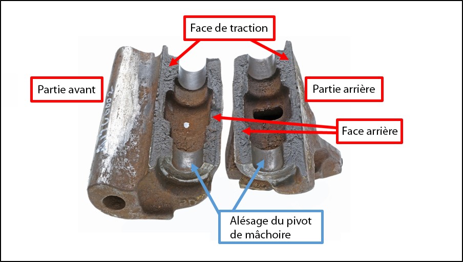 - Une fissure de fatigue s’était formée sur la mâchoire dans la zone de l’alésage du pivot de mâchoire, et la mâchoire a cédé dans le prolongement de la fissure de fatigue causé par surcontrainte.