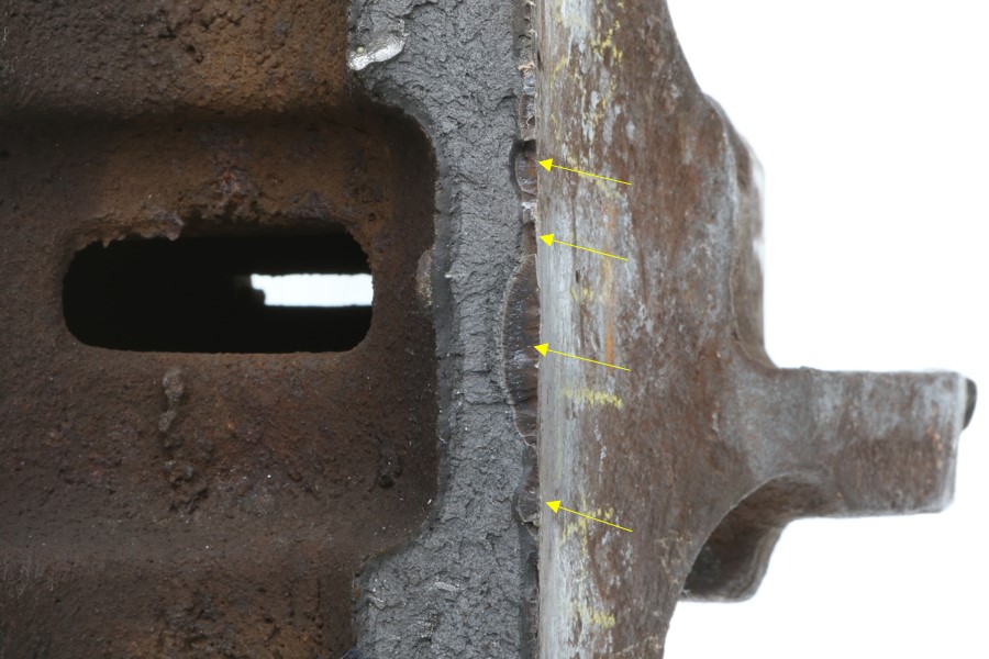 - L’âge des fissures de fatigue, combiné à la porosité et aux inclusions observées, suggère que des lacunes dans le processus de moulage auraient affaibli la mâchoire et qu’elle s’est rompue sous des contraintes d’exploitation normales.