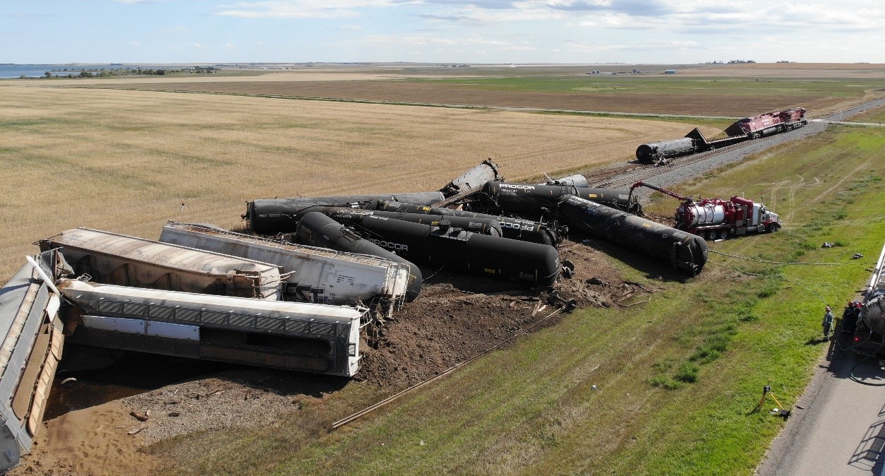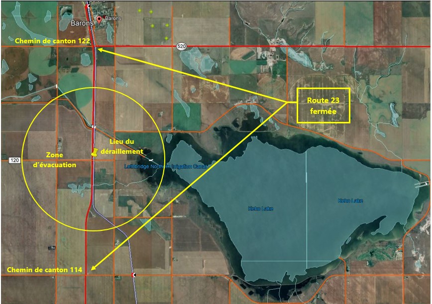 À 7 h 43, alors que le train roulait à 40 mi/h, il y a eu un freinage d’urgence provenant de la conduite générale au point milliaire 17,8, à environ 4 kilomètres au sud du village de Barons (Alberta). Une fois le train immobilisé, l’équipage l’a inspecté et a déterminé que la 2e locomotive de tête et les 21 wagons suivants, dont 11 wagons-citernes, avaient déraillé. Il était également évident que plusieurs wagons-citernes contenant des marchandises dangereuses (MD) fuyaient.