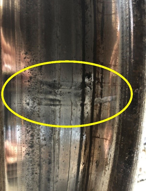 L’inspection visuelle des surfaces de roulement des roues sur la locomotive de tête, qui n’a pas déraillé, a révélé des marques d’éraflure sur les roues L4, L5 et L6 qui roulaient le long du rail est (figures 3 et 4). Ces marques pourraient s’expliquer par un contact entre la surface de la table de roulement des roues et une surface de rail fissurée sur le rail est.