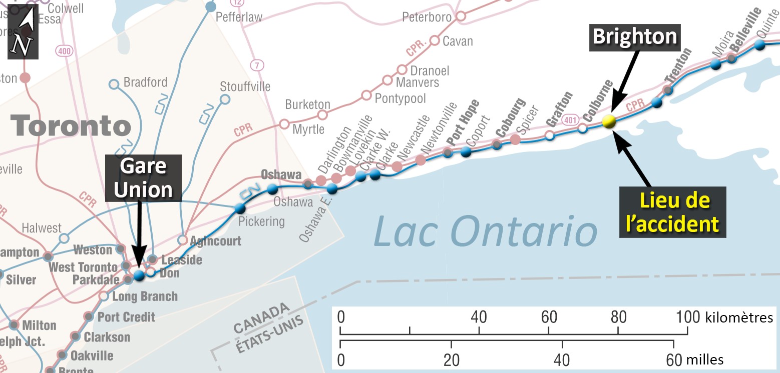 Vers 10 h 07, le train, circulant à environ 95 mi/h sur la voie nord de la subdivision de Kingston, a franchi le point milliaire 240,80 près de Brighton (Ontario), à l’endroit où des selles de rail avaient été déposées sur les traverses entre les rails. Un freinage d’urgence provenant de la conduite générale du train s’est déclenché lorsque la tête du train se trouvait au point milliaire 240,38. Le train a poursuivi sa route en freinage d’urgence sur une distance d’environ 1,48 mille (7814 pieds) avant de s’immobiliser au point milliaire 238,90.