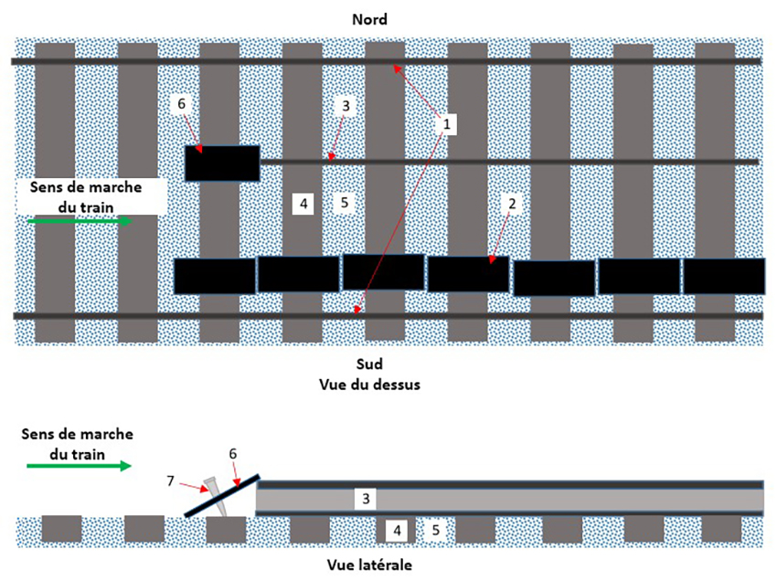 - Le second (élément no 3 dans la figure 2) a été déposé entre les 2 rails de la voie nord. Les extrémités du rail étaient maintenues en place à l’aide de crampons enfoncés de part et d’autre du patin du rail.