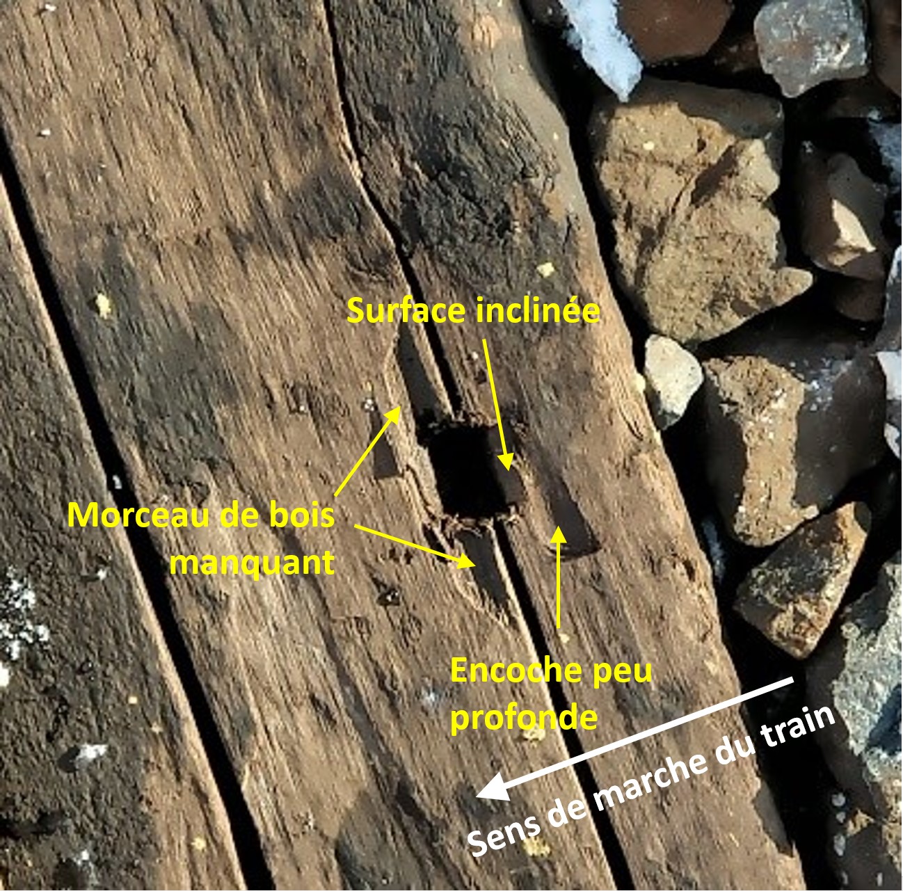 - Le dessus de la selle de rail s’était enfoncé sous la surface de la traverse, ce qui indique que le bois était en décomposition.