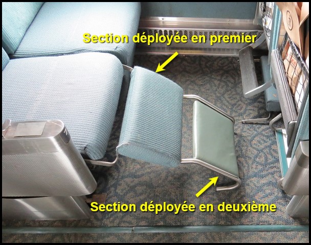 Le siège 7B, comme tous les sièges de cette voiture, est muni d’un repose-jambes escamotable. Lorsqu’il est rangé en position normale (non déployé), le repose-jambes est replié sur lui-même entre le dessous du siège et le plancher de la voiture (figure 3).