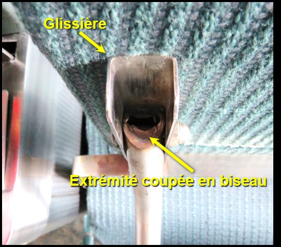 La première section du repose-jambes est attachée à chaque côté du siège par 2 bras pivotants en métal. La seconde section, de plus petite taille, se déplie à l’aide de 2 bras pivotants faits de tubes en métal qui sont insérés dans des glissières de fixation situées sous la première section. Les extrémités des tubes en métal sont coupées en biseau pour leur permettre de pivoter librement en avant et en arrière dans les glissières en métal (figure 5).