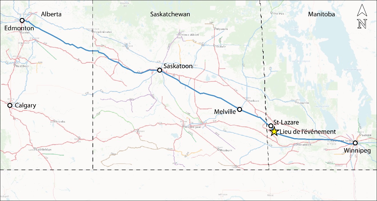 Le 14 février 2019, vers 11 h, heure normale des Rocheuses, le train-bloc U73451-11 (le train) de la Compagnie des chemins de fer nationaux du Canada (CN) est parti de Bruderheim (Alberta) [point milliaire 99,2 de la subdivision de Vegreville du CN] à destination de Superior (Wisconsin, États-Unis), via Winnipeg (Manitoba) et Fort Frances (Ontario). Avant le départ, le train a été inspecté par un inspecteur accrédité de matériel remorqué et a fait l’objet d’un essai de frein no 1. Ce train était désigné comme un train cléNote de bas de page 4 exploité sur un itinéraire cléNote de bas de page 5.
