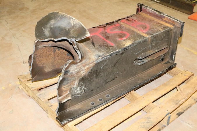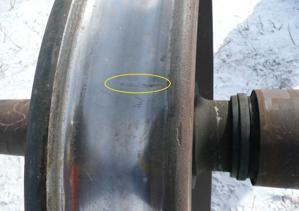 Bien que l’essieu monté avant no 4 du 5e wagon soit demeuré sur les rails, la table de roulement de roue R4 sur le rail sud portait une marque d’impact telle qu’en produirait un contact avec un rail brisé (figure 2). Les 3 autres essieux montés du wagon VMSX 280746 ont déraillé. Des marques d’impact semblables ont été relevées sur les tables de roulement du côté sud des wagons 1 à 4 derrière les locomotives, mais aucune marque n’a été relevée sur les roues des locomotives.