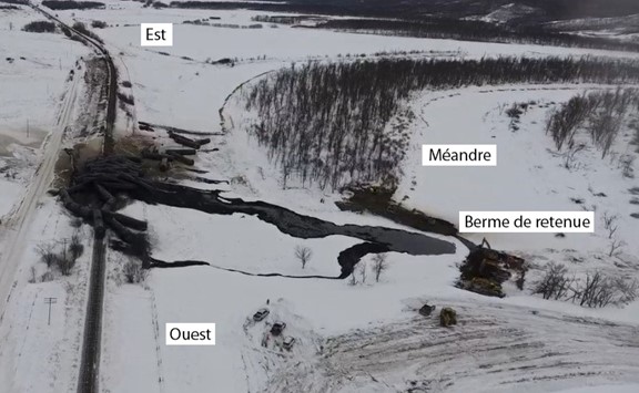 On a aménagé une berme de sol pour éviter que le produit déversé ne contamine un ancien méandreNote de bas de page 8 à proximité.