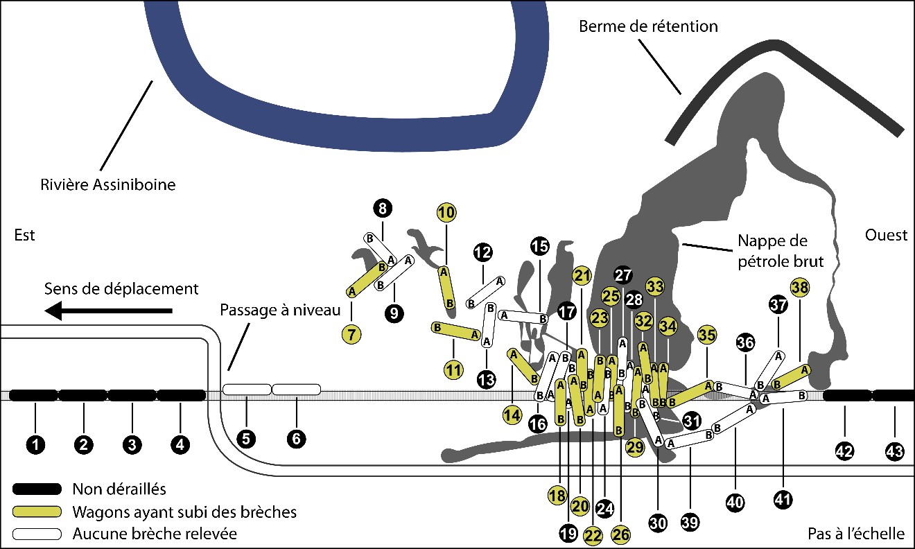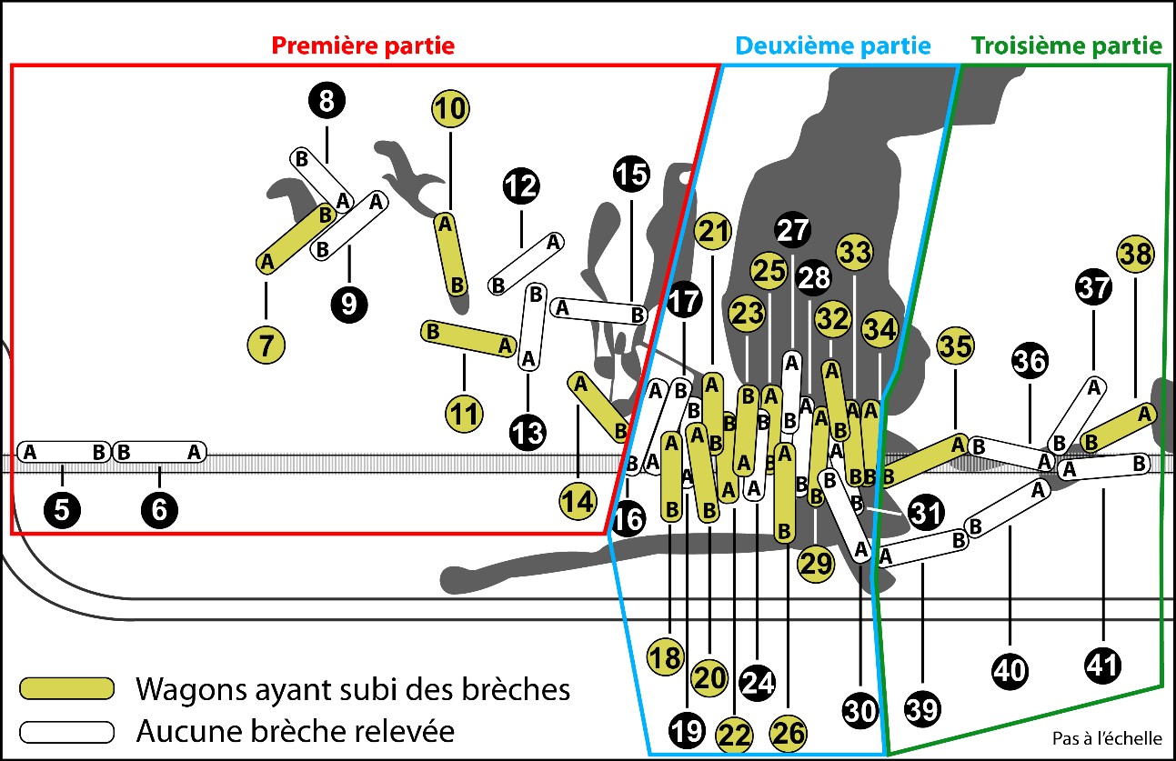 Toutes les roues du 6e wagon ont déraillé. Le train s’est séparé entre les 6e et 7e wagons, et les 35 autres wagons-citernes ayant déraillé (de la 7e à la 41e position) se sont immobilisés dans diverses positions le long de l’emprise entre les points milliaires 197,39 et 197,49 (figure 3).