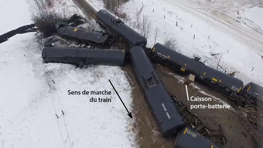 Dans la vidéo captée par la caméra orientée vers l’avant de la locomotive de tête, juste après le passage de la locomotive près d’un caisson porte-batterie situé au point milliaire 197,48 de la subdivision de Rivers du CN, on peut percevoir une vibration de l’image enregistrée et entendre un bruit fort. Neuf secondes plus tard, un freinage d’urgence s’est déclenché, alors que 37 wagons-citernes de catégorie 117R situés de la 5e à la 41e position derrière les locomotives de tête déraillaient.