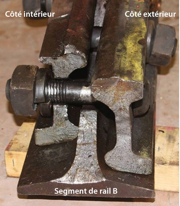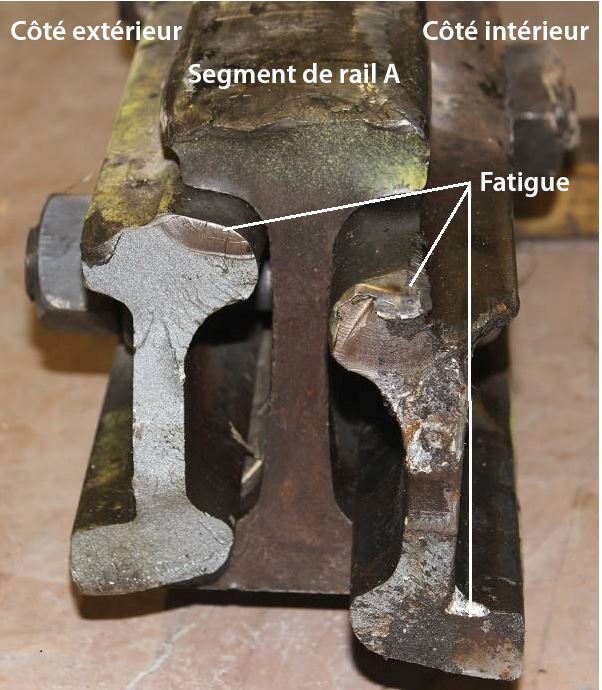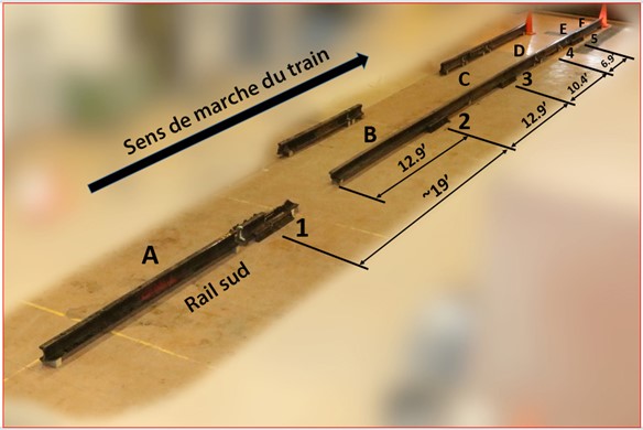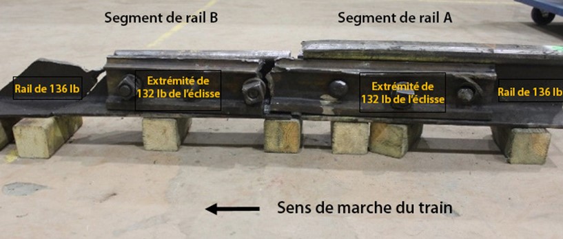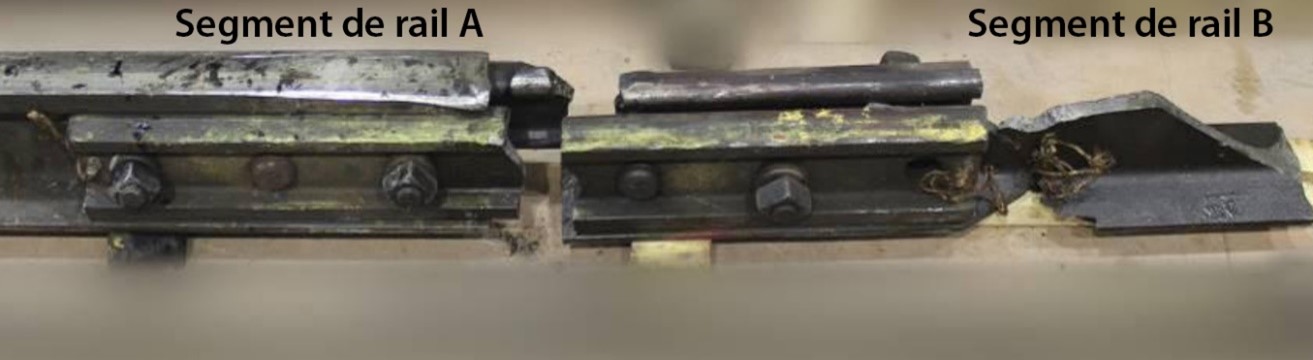 L’enregistrement vidéo, la présence de marques d’impact observées sur les tables de roulement de roue du côté sud sur les wagons 1 à 5 derrière les locomotives de tête, et l’état des éclisses rompues dans le joint 1 indiquent que l’accident s’est produit lorsque le joint 1 du rail sud s’est rompu sous le train-bloc de pétrole brut.