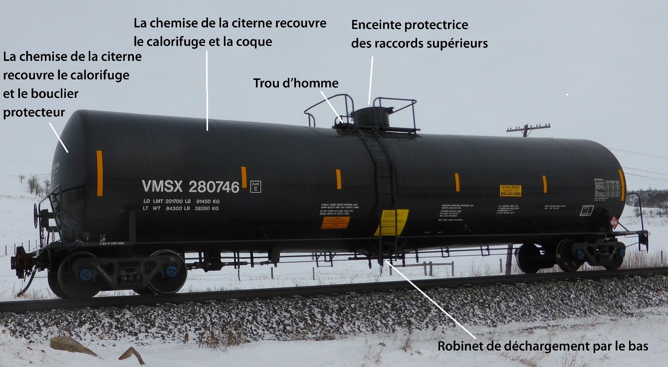 Tous les wagons-citernes de l’événement à l’étude étaient des wagons-citernes de catégorie 117R. Il s’agissait de wagons de catégorie 111 fabriqués conformément à la norme CPC-1232 de l’Association of American Railroads (AAR). Les wagons étaient équipés de chemises, de calorifuge et de boucliers protecteurs complets, et on leur avait installé en rattrapage des poignées de robinet de déchargement par le bas modifiées pour qu’ils soient conformes à la norme pour les wagons-citernes de catégorie DOT 117R. Plusieurs de ces caractéristiques semblent avoir influé sur la quantité de pétrole brut déversée lors de ce déraillement.