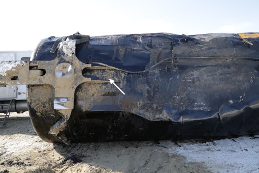 En raison du poids du produit, environ 11 % du volume de ces wagons-citernes était de l’espace libre (creux de chargement). Lorsque le creux est plus important, il reste davantage d’espace que peut occuper le produit dans la citerne si celle-ci est déformée lors d’un déraillement. Le creux moyen de 11 % à l’intérieur des wagons-citernes chargés a diminué encore davantage le risque de ruptures sous pression hydraulique des coques de citernes pendant le déraillement, ce qui a minimisé la quantité de produit déversée et le risque d’incendie.