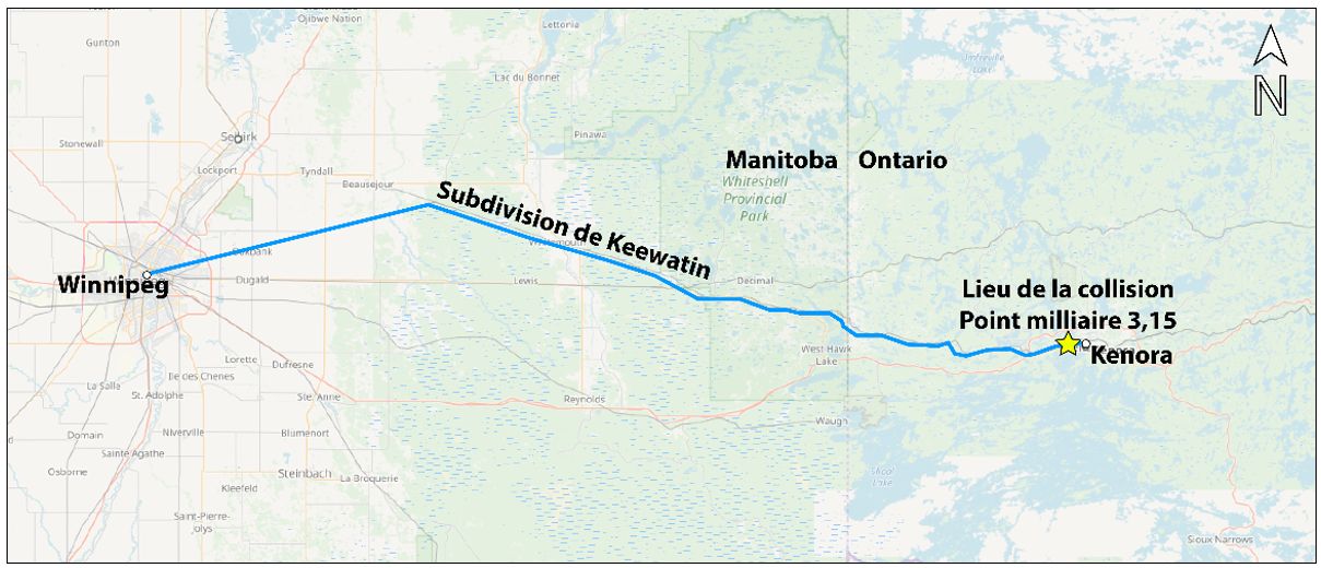 Le 8 août 2019, une équipe de conduite du Chemin de fer Canadien Pacifique (CP) a été appelée à se présenter à 2 h 40Note de bas de page 1 à Winnipeg (Manitoba). L'équipe devait conduire le train de marchandises 320-173 du CP sur la subdivision de Keewatin du CP de Winnipeg (point milliaire 125,7) jusqu'à Kenora (Ontario) (point milliaire 0,0) (figure 1). L'équipe de conduite était formée d'un mécanicien de locomotive et d'un chef de train; les deux étaient qualifiés pour leur poste respectif, répondaient aux exigences relatives au repos et à la condition physique, et connaissaient bien le territoire.