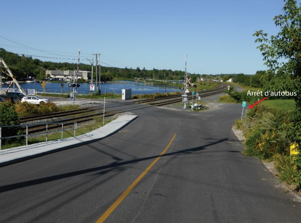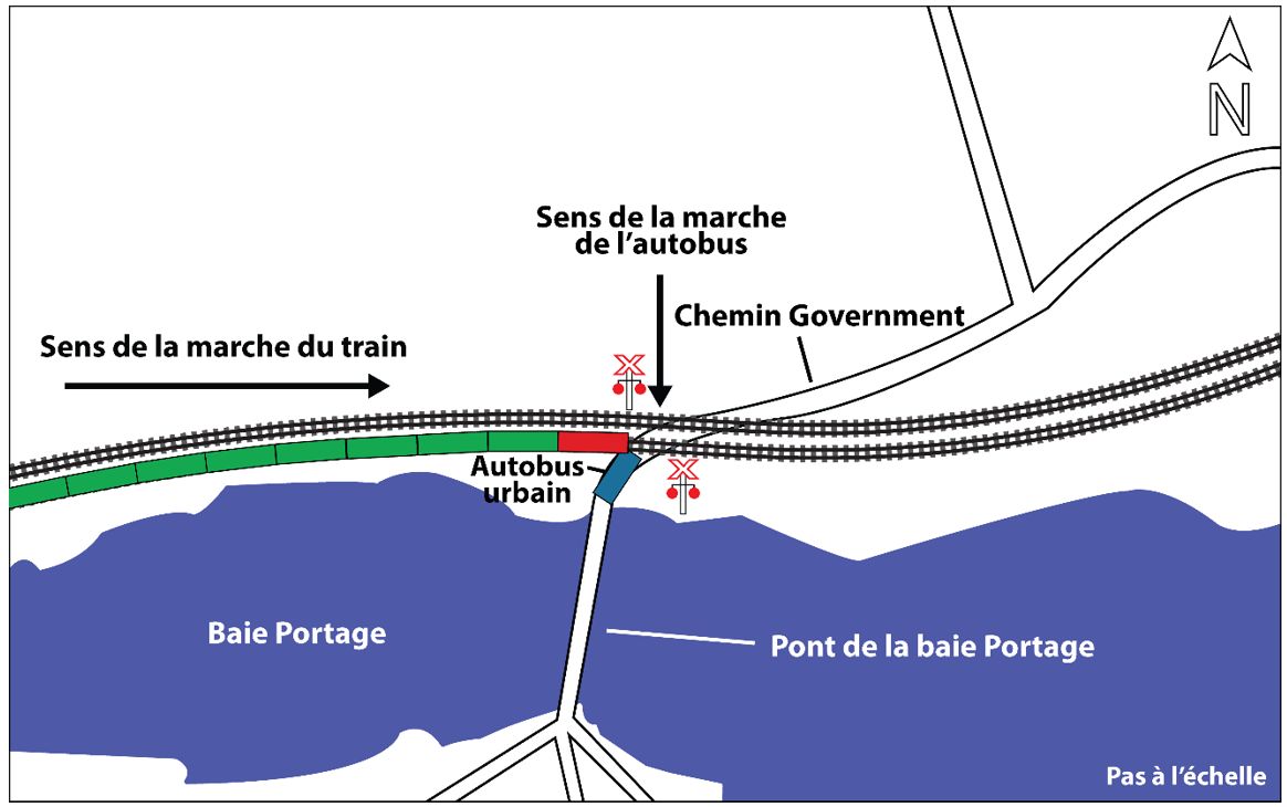 Le jour de l'événement, vers 9 h 33, l'autobus roulait vers le sud sur la partie en pente descendante du chemin Government vers l'arrêt d'autobus qui se trouve en bas du chemin, juste avant le passage à niveau (figure 4). Le conducteur a vu un train qui approchait au loin. Les feux du passage à niveau clignotaient et la sonnerie retentissait, mais les barrières n'avaient pas commencé à descendre. Aucun passager n'attendait à l'arrêt d'autobus à ce moment.