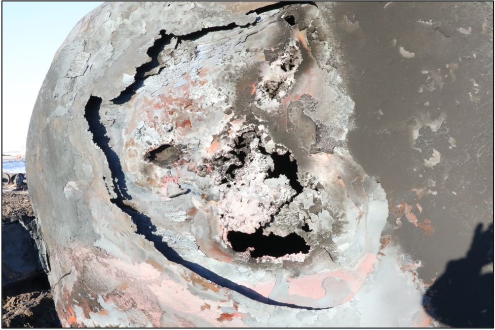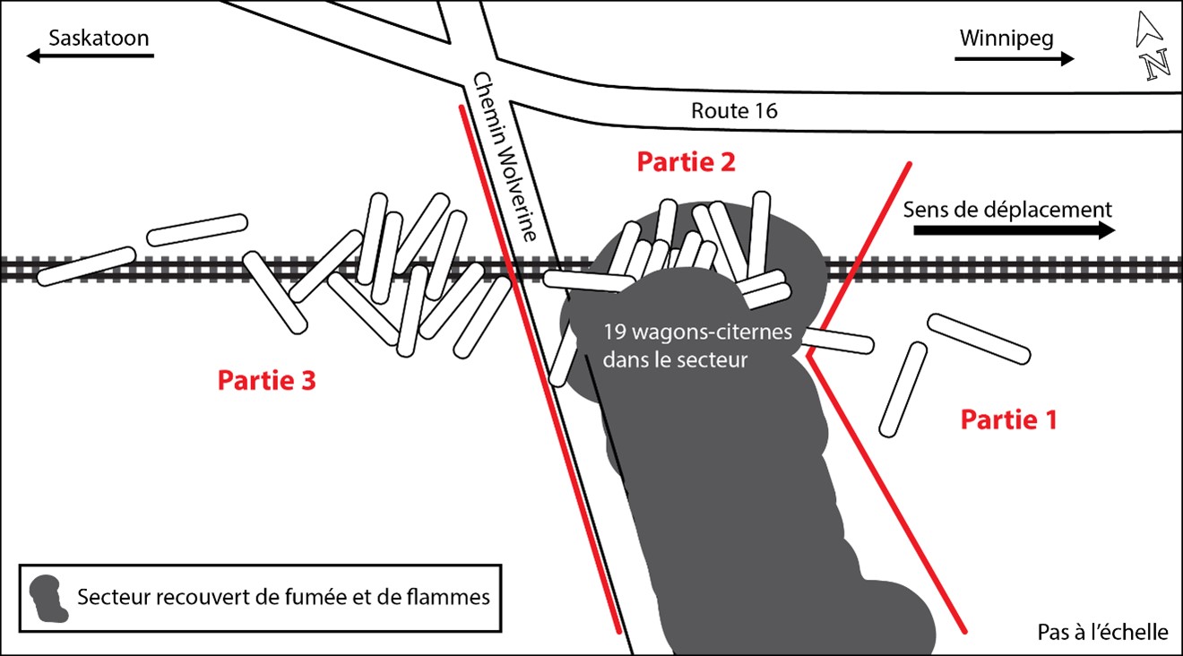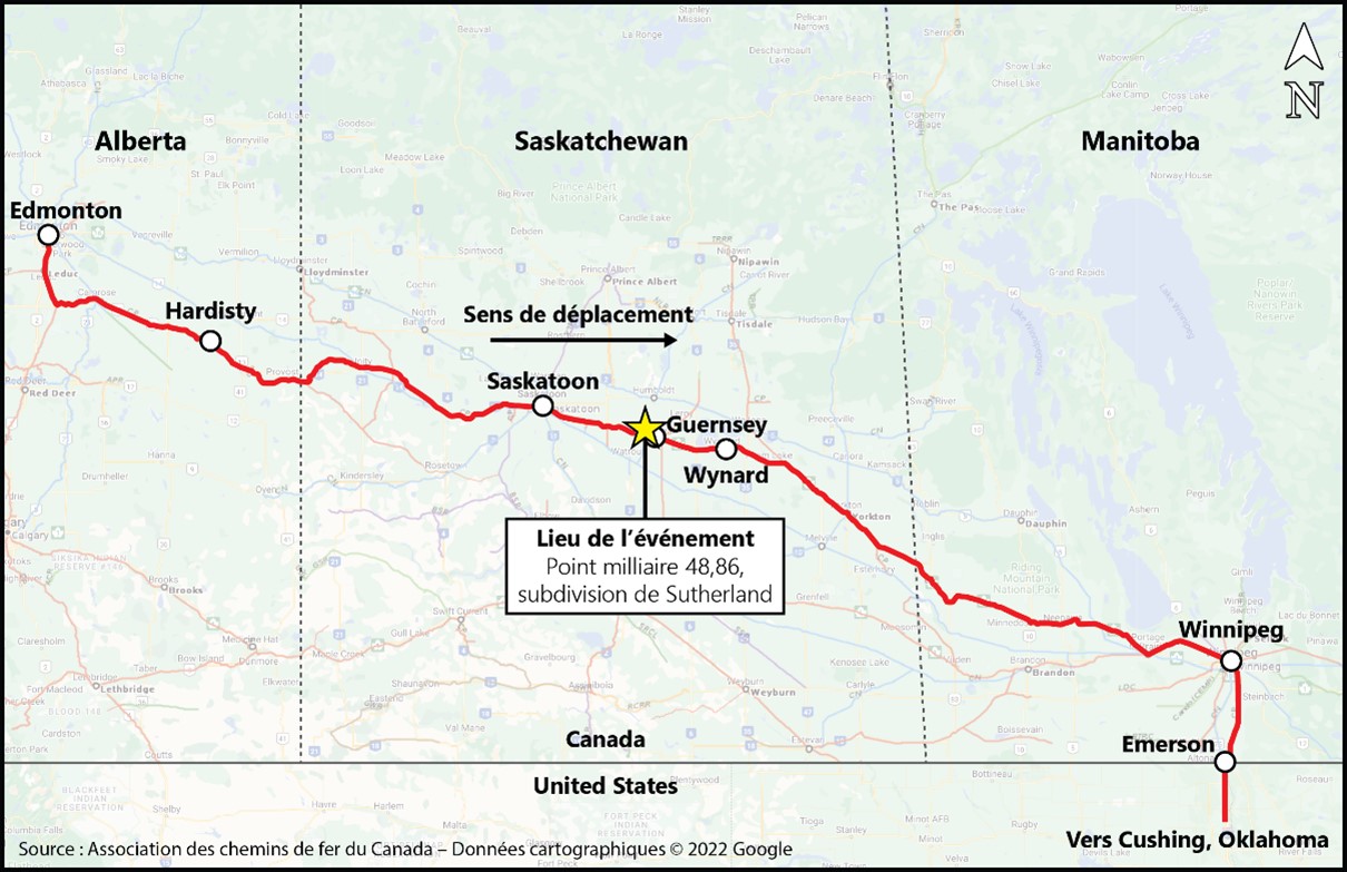 Vers 0 h 10 le 9 décembre 2019, le train circulait vers l’est à 44 mi/h dans la subdivision de Sutherland. Alors que le train s’approchait du passage à niveau public passif du chemin Wolverine (point milliaire 48,85), situé à environ 7 km à l’ouest de Guernsey (Saskatchewan) (Figure 1), l’équipe a remarqué une brèche dans le rail sud. Au moment où la locomotive de tête entrait en contact avec la brèche, elle s’est inclinée vers le sud. Immédiatement après, un freinage d’urgence provenant de la conduite générale a été déclenché. L’équipe a regardé en arrière et a vu une forte explosion au moment où le reste du train se détachait de la locomotive de tête et du premier wagon. De nombreux wagons-citernes en tête de train avaient déraillé et étaient en feu.