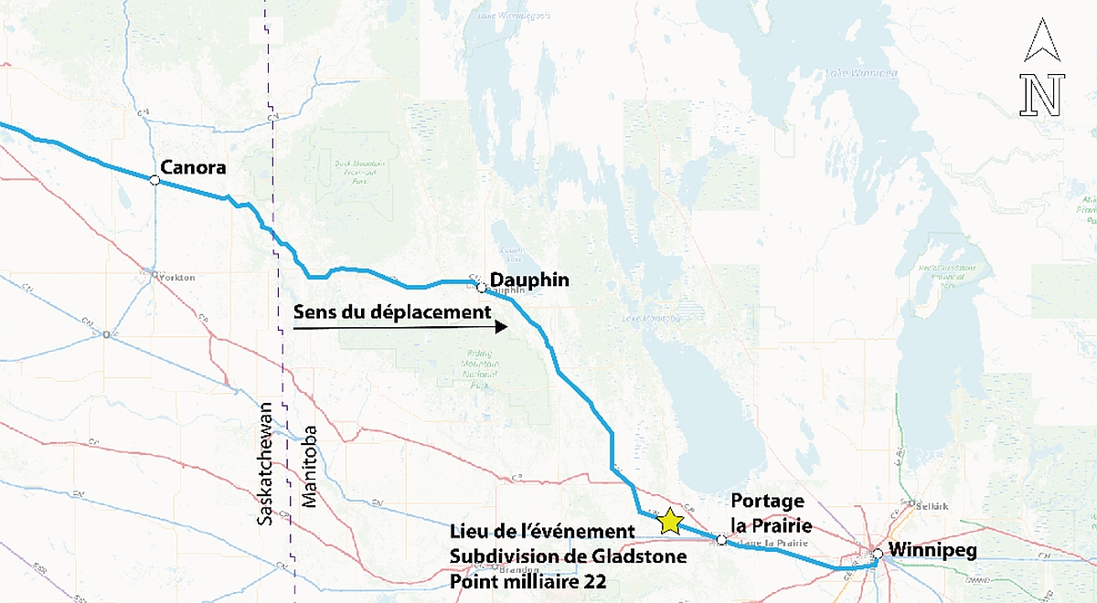 La subdivision de Gladstone du CN est constituée d’une voie principale secondaireNote de bas de page 4 qui relie Kearns au Manitoba (point milliaire 0,0), à Dauphin au Manitoba (point milliaire 121,7). Les mouvements de train sont régis par le système de régulation de l’occupation de la voie (ROV), conformément au Règlement d’exploitation ferroviaire du Canada (REF), et ils sont supervisés par un contrôleur de la circulation ferroviaire du CN en poste à Edmonton (Alberta). Le territoire couvert par le système de ROV n’est pas équipé d’un système de signalisation en voie ni de circuits de voie connexes pour régir les mouvements. De tels systèmes de signalisation en voie aident à déceler les rails rompus avant l’arrivée d’un train.