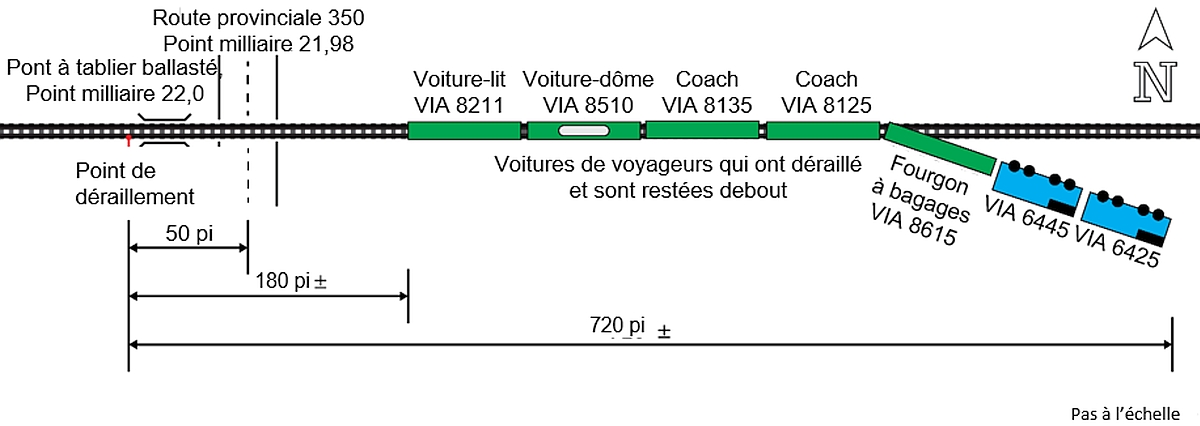 Les marques observées au sol indiquent que toutes les voitures et locomotives du train VIA 692 ont brusquement déraillé vers le côté sud de la voie et se sont arrêtées sur le côté est du passage à niveau. Les 2 locomotives ont terminé leur course sur le côté, tandis que les 5 autres voitures sont demeurées debout (figure 2).