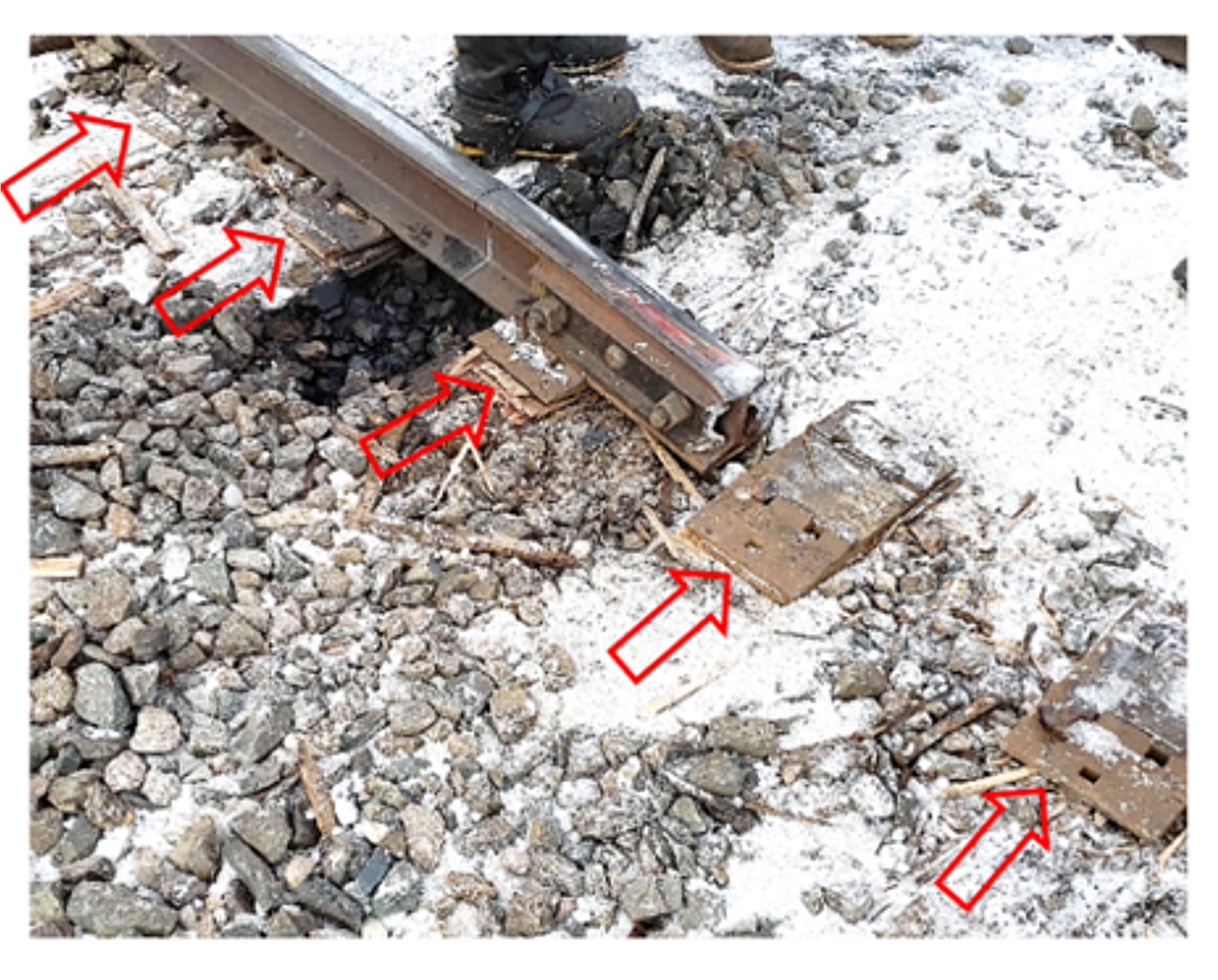 - Le 30 décembre 2019, une exception de nivellement transversal de la VTI a été relevée dans la zone du joint sur le rail sud. Une équipe d’entretien de la voie est intervenue et a découvert que le joint était suspendu à ½ pouce au-dessus des selles. Des cales en contreplaqué ont été ajoutées pour rectifier le défaut.