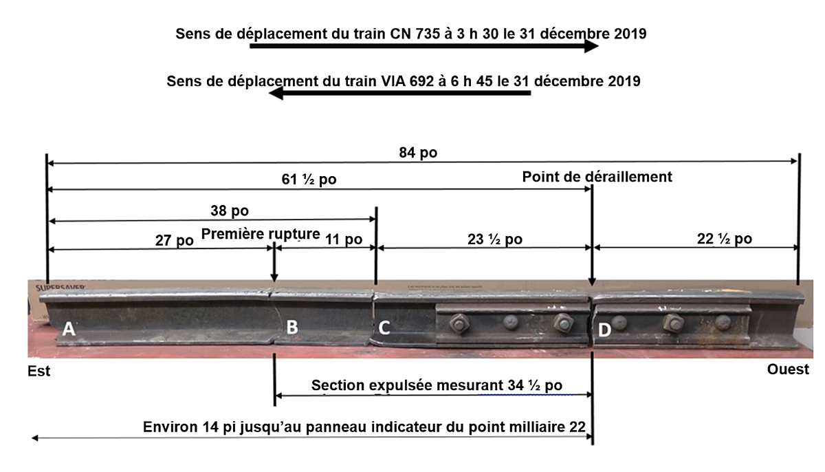 Le schéma observé des dommages causés par l’impact sur le champignon du rail indique que les défaillances du rail et de l’éclisse sont probablement survenues au passage du train CN 735 en direction ouest. Les défaillances (les ruptures B, C et D) se sont produites progressivement et ont engendré l’expulsion d’une section du rail sud, ce qui a créé un écart de 34 ½ pouces au moment où le train CN 735 a traversé puis quitté le secteur. Le train suivant, le VIA 692 en direction de l’est, n’a pas pu surmonter cet écart et a immédiatement déraillé du côté sud de la voie, à l’extrémité ouest du joint rompu.