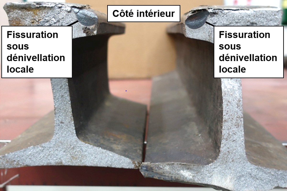 Dans chacune des 3 défaillances (ruptures de rail B et C, ainsi que le joint rompu D), des fractures fragiles se sont formées à partir des extrémités des fractures préexistantes et se sont propagées sur le reste des sections transversales. Les fissuration sous dénivellation locale préexistantes du champignon de rail et les fissures de fatigue des éclisses ont agi comme autant de pointes de contrainte et ont entraîné la fragilisation par le biais de fractures dans le rail sud et dans les éclisses, respectivement.