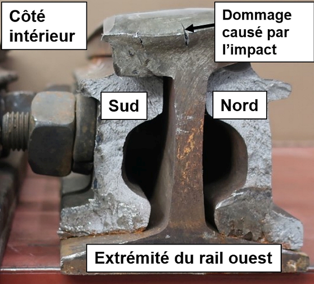 En raison de l’état du nivellement transversal dans le secteur du déraillement, le joint est du rail de raccord aurait été soumis à un déplacement vertical et au choc d’une charge cyclique au passage de chaque train. De telles charges sont reconnues pour accélérer la croissance de toute fissure qui peut se trouver dans les rails ou dans les éclisses.