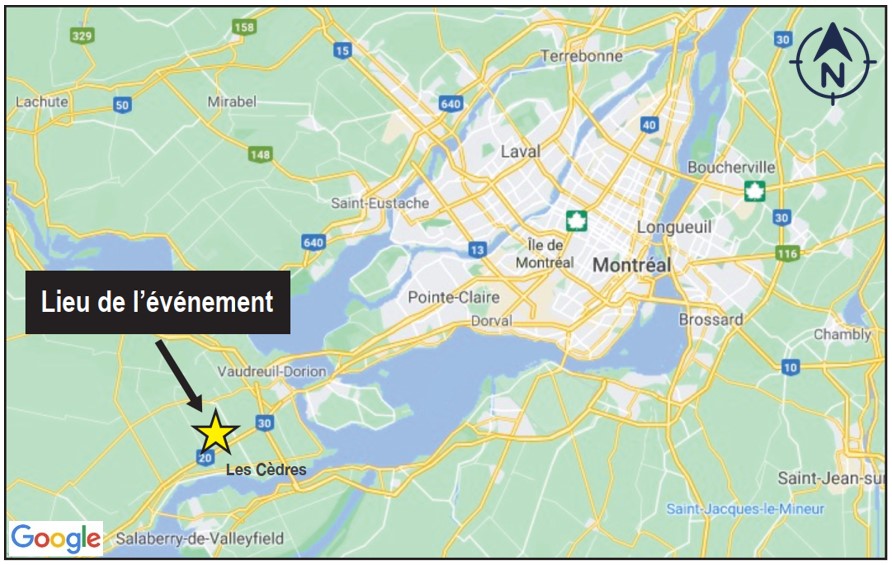 Vers 21 h 32Note de bas de page 1, le train circulait à la vitesse permise (95 mi/h) en direction est sur la voie principale nord de la subdivision de Kingston de la Compagnie des chemins de fer nationaux du Canada (CN). Le train approchait du point milliaire 31 lorsque les deux mécaniciens à bord de la locomotive ont remarqué une lumière éblouissante au loin. Dès que le mécanicien de locomotive aux commandes a réalisé que cette lumière semblait provenir de matériel roulant se trouvant sur la même voie que le train, il a immédiatement effectué un serrage à fond des freins à air du train et a activé le sifflet et la cloche de la locomotive. Quelques secondes plus tard, alors qu’il se déplaçait encore à une vitesse de près de 83 mi/h, le train a heurté un véhicule d’entretien rail-route (STL 099285) de type camionnette au point milliaire 30,5, dans la municipalité de Les Cèdres (Québec) (figure 1).