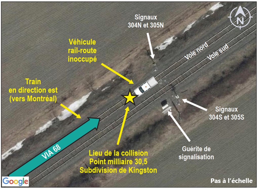 La subdivision de Kingston s’étend du point milliaire 10,3 (Dorval Est, Québec), jusqu’au point milliaire 333,8 (Toronto, Ontario). La voie aux environs du lieu de la collision est une voie principale double. Les deux parties sont désignées « Voie nord » et « Voie sud », conformément à la règle 81 du Règlement d’exploitation ferroviaire du Canada (REF). La circulation des trains y est régie par la commande centralisée de la circulation (CCC), en vertu du REF. Tous les mouvements sont supervisés par un CCF du CN en poste à Edmonton (Alberta).