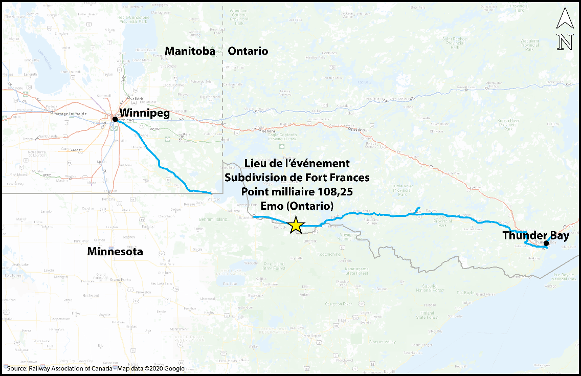 Le 18 février 2020 à 16 h, heure normale du CentreNote de bas de page 1, une équipe d’exploitation de la Compagnie des chemins de fer nationaux du Canada (CN) a été commandée à Winnipeg, au Manitoba, pour le train X35041-18. Ce train cléNote de bas de page 2 devait emprunter un itinéraire cléNote de bas de page 3 vers l’est, de Winnipeg à Fort Frances, en Ontario, dans les subdivisions de Sprague et de Fort Frances du CN. L’équipe de train se composait d’un mécanicien de locomotive et d’un chef de train. Tous deux étaient qualifiés pour leur poste respectif, satisfaisaient aux exigences en matière d’aptitude au travail et de repos, et connaissaient bien le territoire.