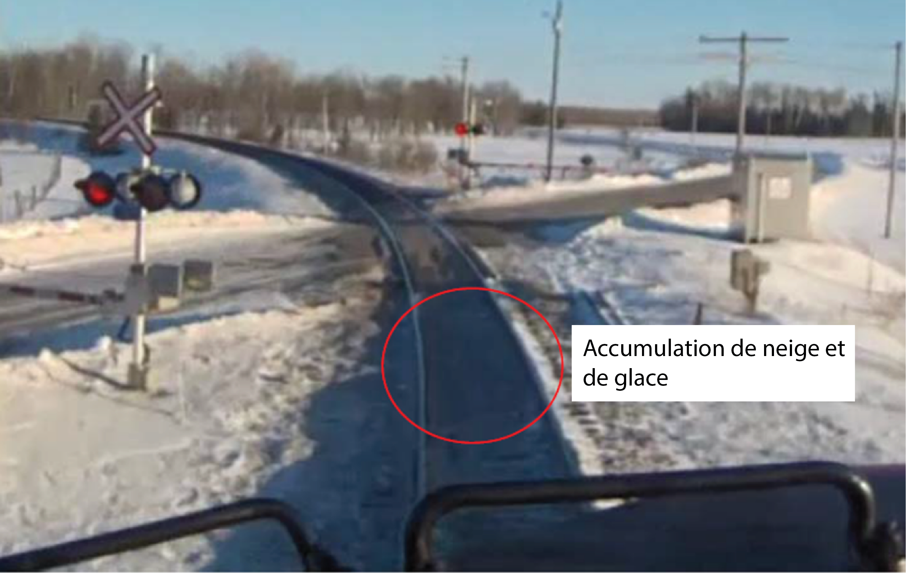 Plus tôt dans la journée, vers 16 h, le train du CN précédent, Q11831-16 (train 118), a traversé en toute sécurité le site de l’incident à la lumière du jour, alors que la température ambiante était de −14 °C. Un examen de l’enregistrement vidéo de la caméra orientée vers l’avant sur la locomotive de tête du train 118 a révélé une accumulation de neige et de glace juste avant et à côté du rail haut (rail sud), à proximité du point de déraillement initial présumé, près du point milliaire 108,25 (figure 3). Toute accumulation de neige le long de la base de rail peut masquer une accumulation de glace entre le dessous de la base de rail et l’assise du rail sur les selles, ce qui rend le « ice-jacking » difficile à détecter.