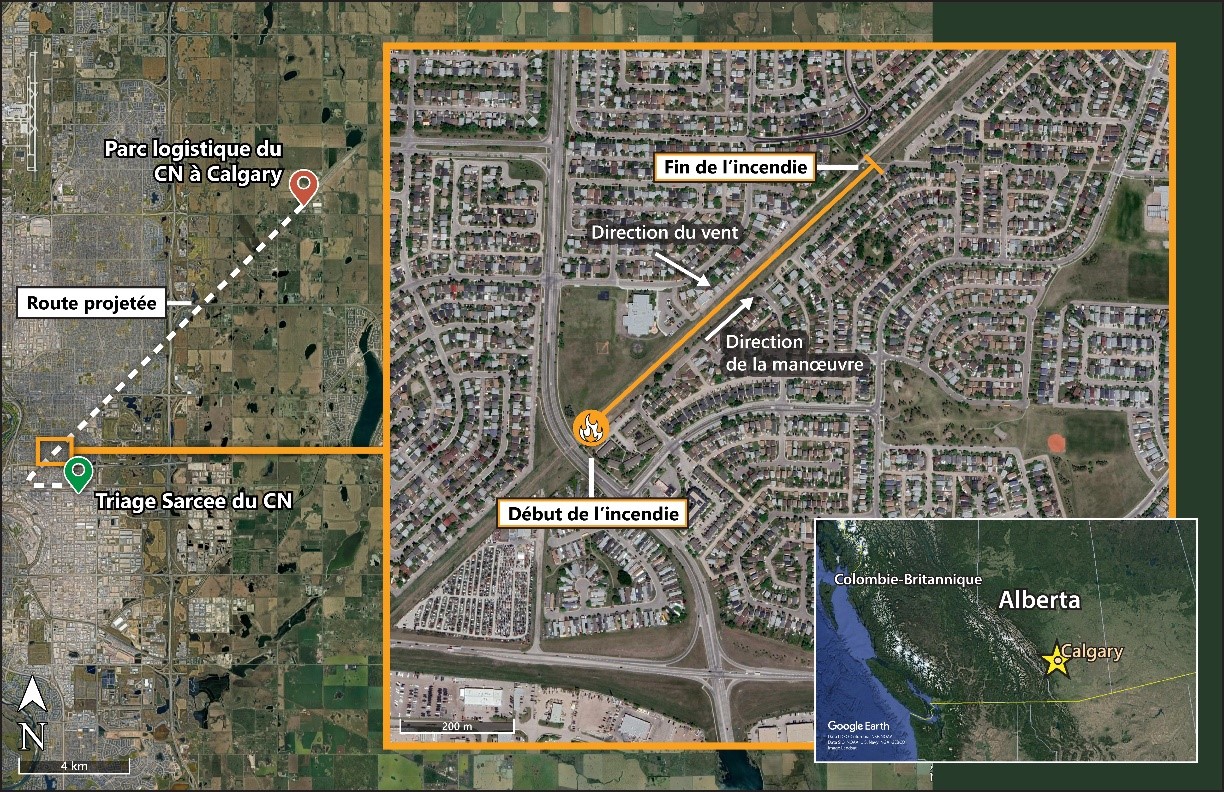 Il a été déterminé par la suite que les feux d’herbe s’étendaient le long de l’emprise sur environ 2376 pieds, de la 36e Rue SE au passage à niveau pour piétons du croissant Erin Mount (figure 2). Ils ont été contenus entre la voie et une clôture métallique du côté est de la voie.