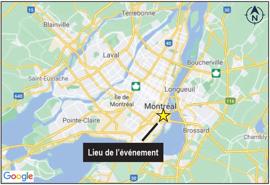 Le 6 janvier 2021, l’équipe du train de manœuvre YPC011-06 de la Compagnie des chemins de fer nationaux du Canada (CN), composée d’un chef de train, d’un mécanicien de locomotive (ML) et d’un chef de train adjoint, effectuait des manœuvres sur une voie près du triage de Pointe-Saint-Charles à Montréal (Québec), au point milliaire 1,9 de la subdivision de Montréal (figure 1). Vers 12 h 25Note de bas de page 1, le train reculait sur la voie PD06, l’embranchement du Port de Montréal, à une vitesse approximative de 10 mi/h en direction ouest vers le triage. Lors d’un arrêt à l’approche du signal 410RC, un étirement brusque provoqué par le jeu des attelages s’est produit et s’est propagé jusqu’au wagon de tête COER 353680. Le chef de train adjoint, qui se tenait sur l’échelle de bout de ce wagon, a perdu prise et est tombé sur la voie avant l’arrêt du train. Il a subi des blessures mortelles.