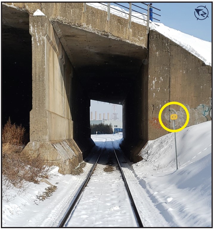 La voie PD06 traverse la rue Bridge à un passage à niveau publicNote de bas de page 2. Des panneaux d’arrêt installés de chaque côté du passage à niveau public indiquent aux mouvements qu’ils doivent s’immobiliser complètement avant le franchissement du passage afin de confirmer l’activation des dispositifs de signalisationNote de bas de page 3. Par la suite, la voie traverse un tunnel d’une longueur d’environ 175 pieds, sous les voies reliant le pont Victoria à la Gare Centrale. Des panneaux indicateurs de gabarit réduit sont situés aux deux extrémités du tunnelNote de bas de page 4 (figure 2). Ces panneaux rappellent aux équipes de train qu’il est interdit de se déplacer sur du matériel roulant en mouvement dans la section délimitéeNote de bas de page 5 afin de réduire les risques de blessures.