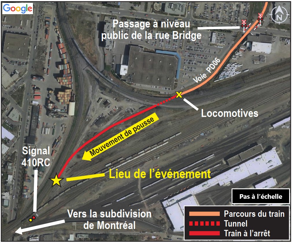 Sur les lieux de l’événement, les locomotives étaient immobilisées à l’est de l’entrée du tunnel sur la voie PD06; le wagon de tête se trouvait à environ 400 pieds du signal 410RC (figure 3).