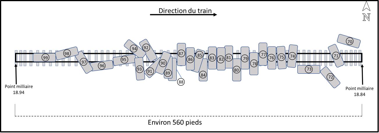 Les wagons déraillés se trouvaient dans une zone couvrant environ 560 pieds allant du point milliaire 18,84 au point milliaire 18,94 (Figure 3). Ils s’étaient immobilisés en diverses positions le long de l’emprise :