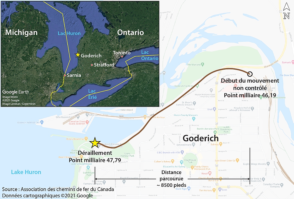 En arrivant au triage Goderich, le chef de train est descendu du train pour pouvoir manœuvrer les aiguillages de voie pendant le refoulement du train vers le triage et le jumelage de rames sur 2 voies de triage. Le chef de train étant au sol, le train a continué de rouler vers l’ouest. Le ML a effectué un serrage à fond des freins à air des freins automatiques du train ainsi qu’un serrage à fond des freins à air indépendants des locomotives.