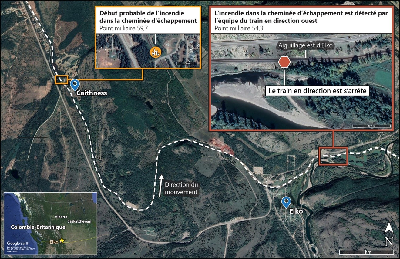 Le 8 juillet 2021, le train 880-066 de la Compagnie de chemin de fer Canadien Pacifique (CP) circulait vers l’est dans la subdivision de Cranbrook, près de Caithness (Colombie-Britannique), lorsque sa locomotive à traction répartie en milieu de train a subi une défaillance mécanique qui a provoqué l’émission de flammes par la cheminée d’échappement. En raison de la position éloignée de la locomotive dans le train, la situation est passée inaperçue jusqu’à ce qu’elle soit observée par l’équipe d’un train de sens contraire du CP (V09-012) lors d’un croisement sur la voie d’évitement d’Elko (Colombie-Britannique), environ 5 milles à l’est de Caithness.