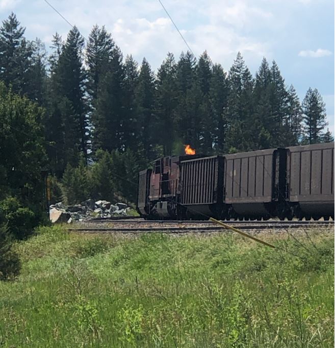 Le train en direction est s’est arrêté sur la voie principale à l’aiguillage est d’Elko. Pendant que le train en direction ouest circulait sur la voie d’évitement, son équipe a effectué l’inspection demandée et a remarqué que des flammes sortaient de la cheminée d’échappement de la locomotive en milieu de train. L’équipe du train en direction ouest a communiqué avec l’équipe du train en direction est pour l’aviser de la situation.