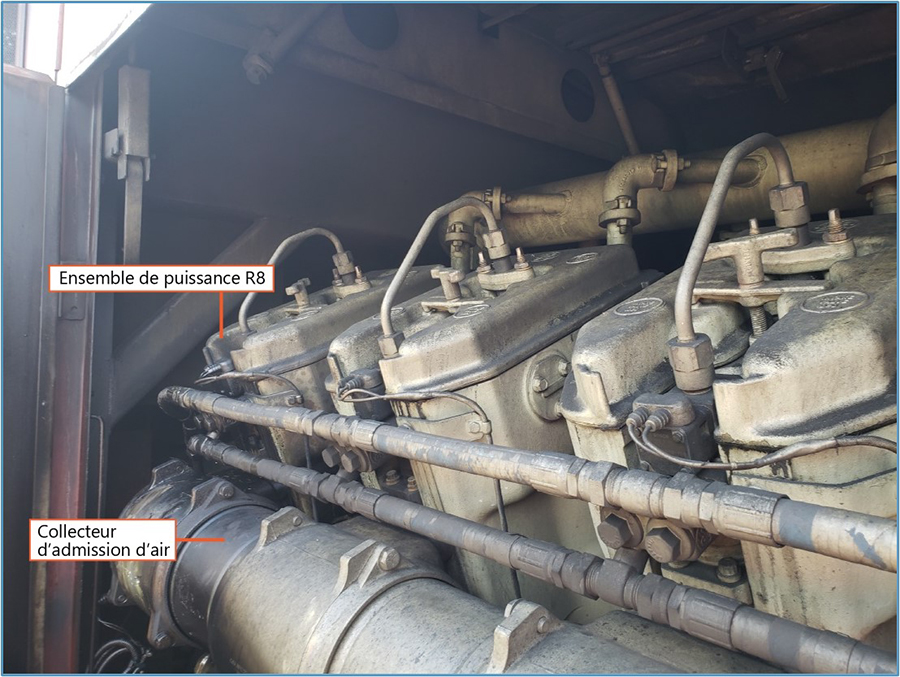L’inspection a permis de déterminer que l’ensemble de puissance R8 (le 8e ensemble de puissance du côté droit) s’était rompu. Un culbuteur de cet ensemble de puissance était brisé, et le boîtier de l’ensemble de puissance ainsi que le collecteur d’admission d’air ont été endommagés. On a constaté qu’une soupape d’échappement s’était rompue et que sa tête avait été gravement endommagée, et que les tiges de manœuvre de la soupape d’échappement restante et des 2 soupapes d’admission étaient déformées. L’embout de l’injecteur de carburant était également brisé. De plus, on a observé une récession du siège de soupapeNote de bas de page 10 sur la soupape rompue.