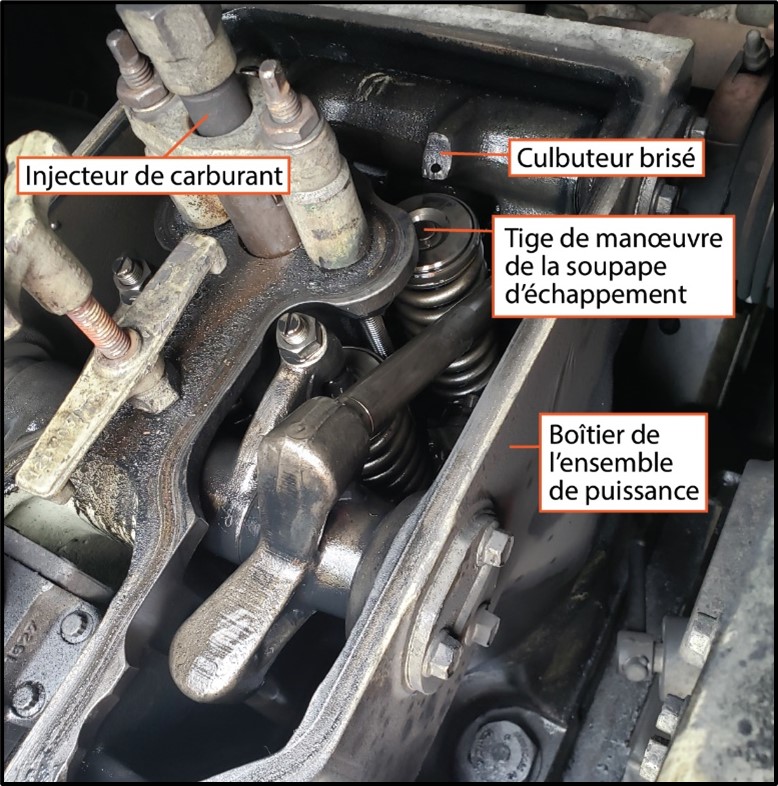 Un examen mécanique de la locomotive effectué par la suite a permis de découvrir la présence d’un culbuteur brisé sur l’ensemble de puissance R8. On a constaté qu’une soupape d’échappement s’était rompue et que sa tête avait été gravement endommagée, et que les tiges de manœuvre de la soupape d’échappement restante et des 2 soupapes d’admission étaient déformées. L’embout de l’injecteur de carburant était également brisé. On a déterminé qu’une soupape d’échappement, qui présentait des signes de récession du siège de soupape, s’était rompue; sa tête est tombée dans la chambre de combustion alors que le moteur était en marche, ce qui a brisé l’embout de l’injecteur de carburant. Comme le montrent les tiges de manœuvre déformées sur les soupapes restantes, le culbuteur s’est brisé après ou pendant l’impact de sa soupape avec la tête de la soupape d’échappement rompue. Le collecteur d’admission d’air a également été endommagé. Il en est résulté une perte de pression dans l’air fourni aux 8 cylindres du côté droit du moteur diesel; par conséquent, le mélange d’air et de carburant fourni à ces cylindres contenait plus de carburant que la normale. De plus, l’injecteur de carburant brisé a continué d’envoyer du carburant non atomisé dans la chambre de combustion et donc par l’orifice ouvert de la soupape d’échappement.