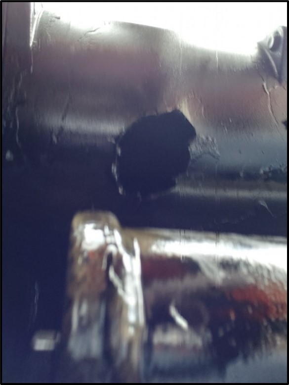 En raison de la perte de pression de l’air de combustion due à l’endommagement du collecteur d’admission d’air, les 8 cylindres du côté droit du moteur diesel brûlaient un mélange riche de carburant et d’airNote de bas de page 11. En outre, l’injecteur de carburant brisé a continué d’envoyer du carburant non atomisé dans le cylindre. Le carburant non brûlé a ainsi pu pénétrer dans le collecteur d’échappement, où il a été enflammé par les gaz d’échappement chauds avant de sortir de la cheminée d’échappement.