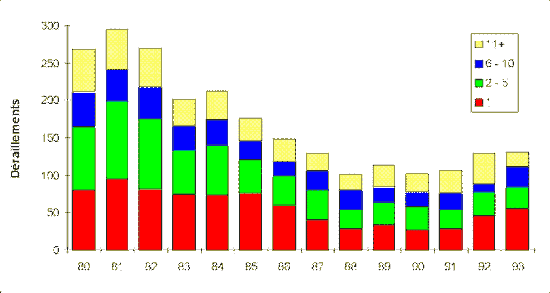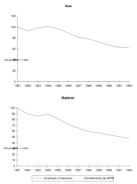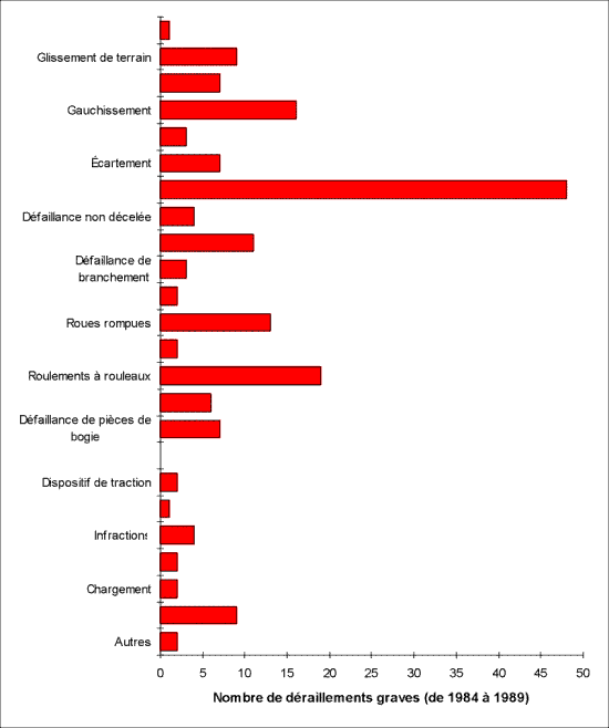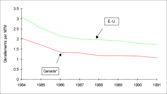 Le nombre de déraillements mettant en cause plus de cinq wagons ou voitures est passé de plus de 100 en 1980 à quelque 50 en 1985 et est resté à peu près le même depuis. Quant au nombre de déraillements mettant en cause de deux à cinq wagons ou voitures, il a diminué de 1981 à 1988 et est resté stable par la suite.