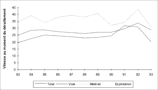 dans les zones à forte densité de population. On peut voir à la figure 6 que la vitesse moyenne des trains ayant déraillé est restée presque inchangée depuis 1983 (les données sur la vitesse n'étaient pas systématiquement consignées avant 1983).