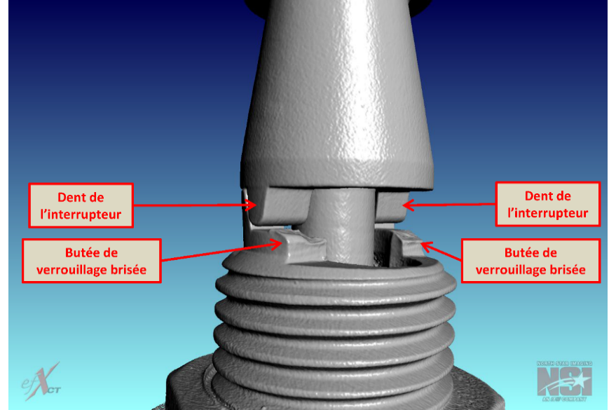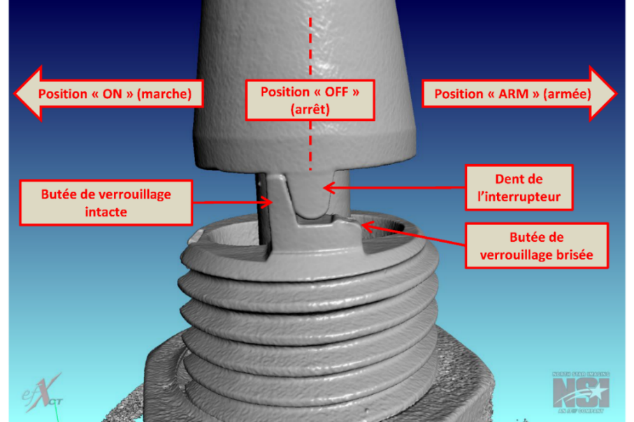 Suite à cette découverte, l’examen visuel de 2 autres ELT de même modèle présentes au laboratoire du BST a été fait. L’une des ELT présentait la même défaillance que l’ELT à bord de l’aéronef à l’étude, mais sur les butées de verrouillage du côté opposé, soit ceux situés entre la position « ON » et la position « OFF ».