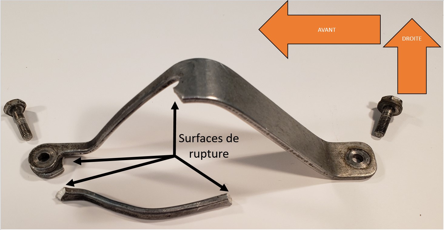 Le support de fixation central des ceintures sous-abdominales de l’aéronef a été envoyé au Laboratoire d’ingénierie du BST à Ottawa (Ontario) pour être soumis à un examen métallurgique. On a déterminé que le support était fait d’un alliage d’aluminium, et que la défaillance n’était pas causée par la fatigue du métal, mais plutôt par une surcharge pendant l’accident.