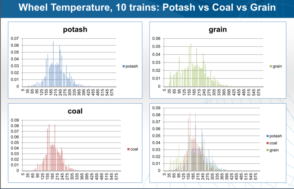 La figure 1 est une représentation graphique des données sur la température des roues qui ont été présentées au comité directeur du projet de recherche sur l’essai automatisé de l’efficacité des freins de train de TC, du CNRC et du CP en juillet 2016Note de bas de page 6. Les données recueillies pour dix trains-blocs de charbon, de potasse et de céréales révèlent que les wagons à céréales sont plus susceptibles d’avoir des roues chaudes et froides, ce qui correspond à des freins inefficaces ou mauvais. En fait, les lignes directrices de l’essai automatisé de l’efficacité des freins de train du CP visant à repérer les freins inefficaces de ses wagons de charbon (< 70 °F et écarts-types < 3 au regard de la moyenne) ne permettaient pas de cerner les freins inefficaces des wagons à céréales, car les trains de céréales avaient une plus grande gamme de température de roues (c.‑à-d. que les roues étaient plus froides).