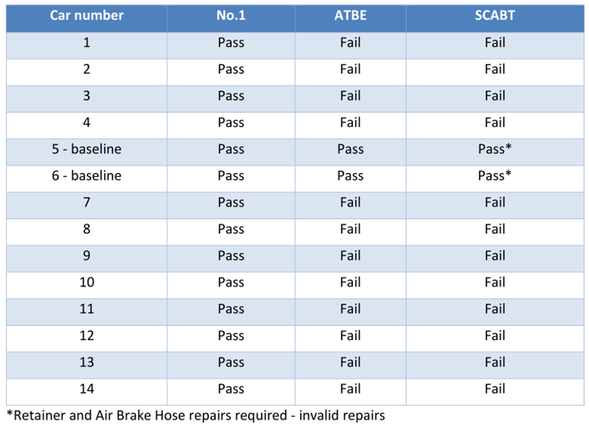 En 2015, Transports Canada, le Conseil national de recherches du Canada (CNRC) et le CP ont entamé un projet de recherche conjoint sur l’essai automatisé de l’efficacité des freins de train (Automated Train Brake Effectiveness [ATBE]) pour vérifier si cet essai automatisé peut être une solution de rechange à l’essai de frein manuel qui est actuellement exigé selon la réglementation canadienne ou si les deux peuvent aller de pairNote de bas de page 4. Dans le cadre de la recherche, on a examiné les données sur la température des roues qui ont été obtenues d’une série de détecteurs de roues froides installés dans le bas de longues pentes où il est nécessaire de serrer les freins à air de façon prolongée pour maîtriser la vitesse des trains. En 2016, les résultats préliminaires de la recherche ont révélé qu’un volume élevé de wagons à céréales avaient des roues froides au freinage (annexe A, figure 1). Par la suite, les chercheurs ont comparé les données de l’essai automatisé de l’efficacité des freins de train et les résultats de l’essai de frein no 1 en utilisant un échantillon de 44 trains de céréales. L’essai automatisé a décelé 695 wagons dont les freins étaient inefficaces alors que l’essai de frein no 1 n’a repéré que 5 wagons; la proportion est donc de 139:1 (annexe A, figure 2). Quatorze wagons décelés par l’essai automatisé ont été sélectionnés de façon aléatoire pour faire l’objet d’un essai des freins à air d’un wagon individuelNote de bas de page 5 et d’une inspection. Tous les wagons de l’échantillon qui avaient des freins inefficaces selon l’essai automatisé ont échoué l’essai des freins à air d’un wagon individuel. Il s’est ensuite avéré que tous ces mêmes wagons étaient défectueux et avaient besoin de réparations (annexe A, figure 3).