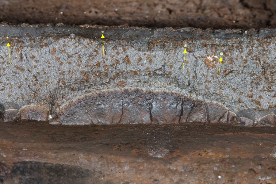 - Un vide de grande dimension et plusieurs autres plus petits ont été notés dans la surface de rupture. À l’intérieur de ces vides se trouvaient des corps étrangers sphériques (indiqués par des flèches à la figure 2 et à la figure 3). Ces corps sphériques, de taille variable, étaient principalement de la silice.